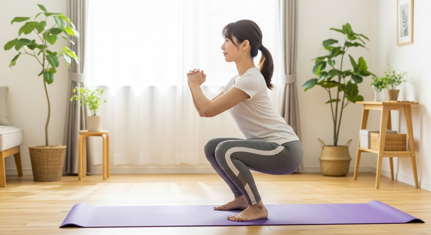 また、しゃがむ深さは無理のない範囲で構いません。膝に不安がある方は、浅めから始めて、徐々に深くしていきましょう。